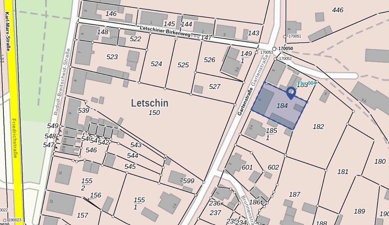 Gemarkung Letschin, Flur 4, Flurstück 184 mit einer amtlichen Fläche von 849 m²